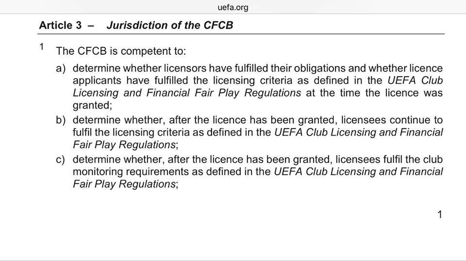 Някакъв анонимник ми обясняваше как CFCB не разглеждало дела за изваждането на клуб от турнирите. Ето тук правилата за компетенцията на CFCB за невежите (и за заинтересованите).
