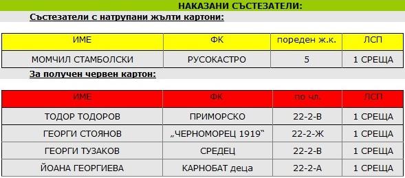 Наказва състезателите на ФК „Странджанец“ Царево: Васил Морфов – ССП за 6 срещи, съгласно чл.23-2-Д, Димитър Георгиев – ССП за 1 година, съгласно чл.25 /считано от 19.03.2017г./, Николай Гочков – ССП за 2 срещи, съгласно чл. 22-2-К. Наказва Дико Киряков /треньор/, с лишаване от право да изпълнява функции от името на отбора за 5 среща, съгласно чл.34, ал.1 т.4 от ДП.