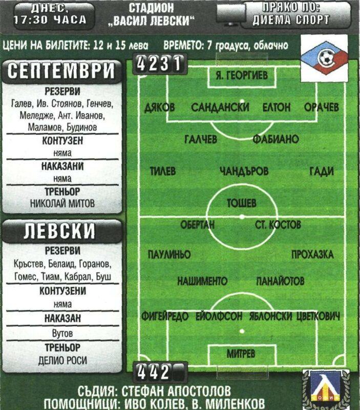 Треньорът на Левски Делио Роси има две дилеми по състава за днешния мач със Септември. Двубоят започва в 17:30 часа на Националния стадион „Васил Левски“. Въпросителните пред италианеца са свързани със защитата и халфовата линия. В отбрана пред Митрев днес ще започнат Милош Цветкович, Давид Яблонски и Холмар Ейолфсон. Претенденти за поста на ляв бек са Иван Горанов и Афонсо фигейредо. Първият не игра лошо срещу Ботев. Вторият пък изненадващо бе оставен извън групата срещу канарчетата. Португалецът бе взет под наем от френския елитен Рен, но не бе убедил, че заслужава да започне на старта на пролетния дял на първенството.