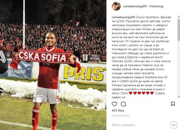 Скъпи приятели, фенове на ЦСКА! Прочетох доста сайтове, които написаха откровено нелепи и неверни информации за мен! Искам да уверя всички вас, най-великата публика, че нито за момент не съм помислял да ви напусна! От първия си ден тук заобичах този клуб с цялото си сърце и до последния ми ден тук ще се боря за това, което обещах, да стана шампион и да играя в Европа с червения екип! Обичам ЦСКА, обичам вас и това никога няма да се промени! Наясно съм,че такава любов няма да намеря почти никъде, затова през пролетта продължаваме заедно борбата към 32-ата!! САМО ЦСКА до края на света! Нямам търпение да ви видя отново с червени шалчета и знамена в ръка!!