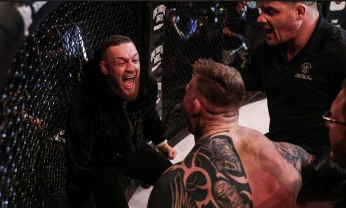 Ирландецът гледаше битката между съотборника си Чарли Уорд и Джон Редмънт, когато изкочи в октагона, за да поздрави по типичния си луд начин Уорд за победата в първия рунд.