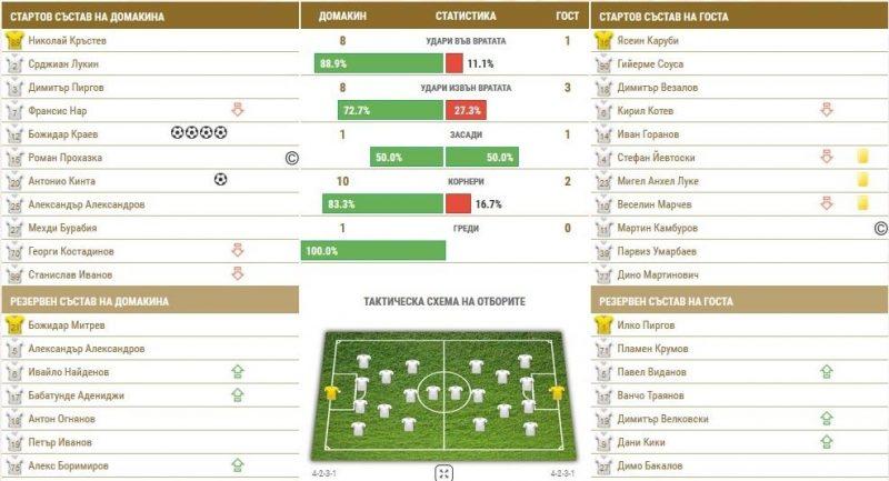 Левски победи Локомотив Пловдив и добави импулс самочувствие в първия си мач от плейофите на първенството. Мачът започна малко мудно, като и двата отбора в първите минути бяха предпазливи. Но само до 12 минута, когато Аниете откри резултата след отлично отиграване на границата на наказателното поле. Голът даде криле на домакините, които видимо увеличиха оборотите. Бурабия и Краев обаче изтърваха изгодни положения. Марчев от състава на Локомотив пък нанесе много опасен удар, който мина на милиметри от страничната греда. В 36 минута Краев реализира след тройна комбинация между него, Аниете и младия Иванов. Три минути по-късно отново Краев бе точен след невероятна грешка на Ел Харуби, който не можа да изчисти точно. Топката попадна в Аниете, който я пусна веднага на Краев и така се стигна до третия гол.