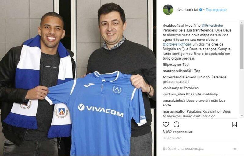 Бразилската футболна легенда Ривалдо използва профила си в социалната мрежа Инстаграм, за да се похвали с трансфера на сина си Ривалдиньо в Левски. Бившият играч на Барселона и Милан пожела на наследника си много успехи със „синята“ фланелка, като не пропусна да благослови и българския клуб.