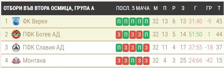 Монтана загуби домакинството си Верея. Това бе последен мач за водения от Атанас Атанасов тим, преди първия плейаут с Нефтохимик. Възпитаниците на Орела показаха характер, след като преди да е изтекъл половин час игра, вече губиха с 0:2. Те обаче успяха да изравнят още до края на първото полувреме. Въпреки това, старозагарци стигнаха до успех с 3:2 в 82-ата минута с гол на Бен Джемиа.