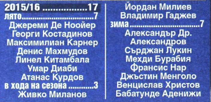 С идването на сина на легендата на Барселона — Ривалдо, пък станахме свидетели на още нещо невиждано. Той е 18-ят нов футболист на „сините“ за този сезон. Това е с един повече от абсолютния връх записан през 2015/16. Тогава треньор на отбора беше Стойчо Стоев. Селекцията отново вървеше бавно и на първата тренировка, за да се получи някаква що годе нормална бройка играчи, групата бе запълнена с един куп юноши. След това обаче лека-полека започнаха да прииждат нови хора – 7 през лятото, три в хода на сезона, а още седем пристигнаха през зимата, за да се оформи крайната бройка до 17.