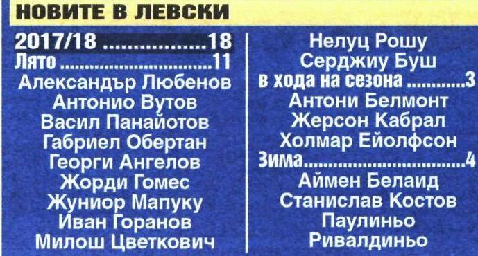 С идването на сина на легендата на Барселона — Ривалдо, пък станахме свидетели на още нещо невиждано. Той е 18-ят нов футболист на „сините“ за този сезон. Това е с един повече от абсолютния връх записан през 2015/16. Тогава треньор на отбора беше Стойчо Стоев. Селекцията отново вървеше бавно и на първата тренировка, за да се получи някаква що годе нормална бройка играчи, групата бе запълнена с един куп юноши. След това обаче лека-полека започнаха да прииждат нови хора – 7 през лятото, три в хода на сезона, а още седем пристигнаха през зимата, за да се оформи крайната бройка до 17.