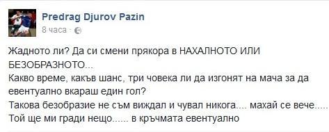 Нулевото равенство на Левски с Локомотив (Пд) предизвика нова порция призиви оставка на Николай Митов. Един от най-големите критици на треньора на „сините“ Предраг Пажин също изрази своето мнение. Ето какво написа бившият защитник на тима от „Герена“ във Фейсбук профила си: