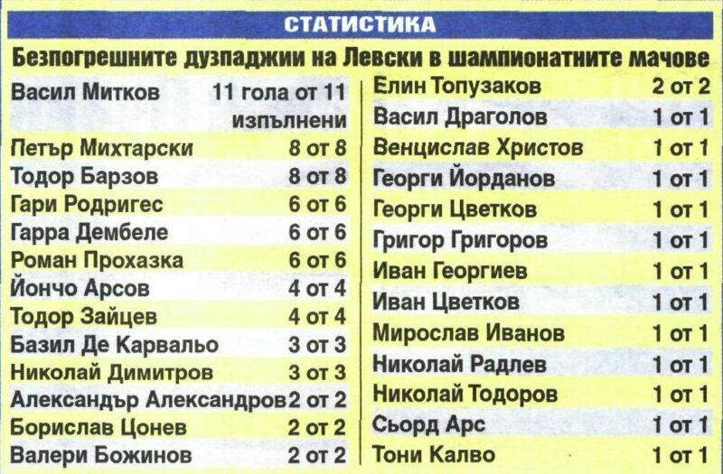 Лидер за всички времена остава Васил Митков – Шопа. В шампионата той е с 11 гола от 11 шута от бялата точка, но пък има един фатален пропуск срещу Динамо (Берлин) в Европа. Веднага след него са Тодор Барзов и Петър Михтарски, които нямат празно от 8 опита.