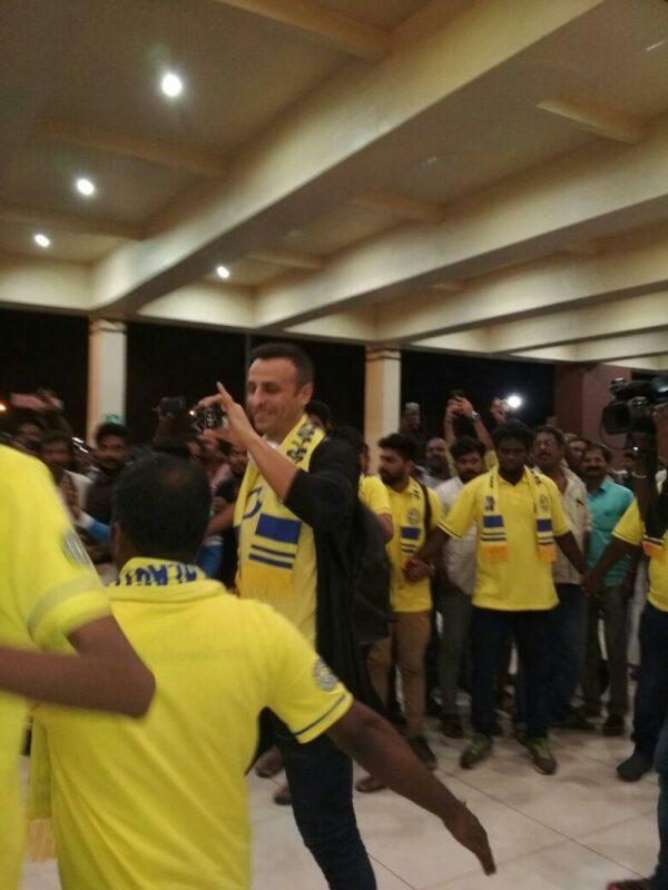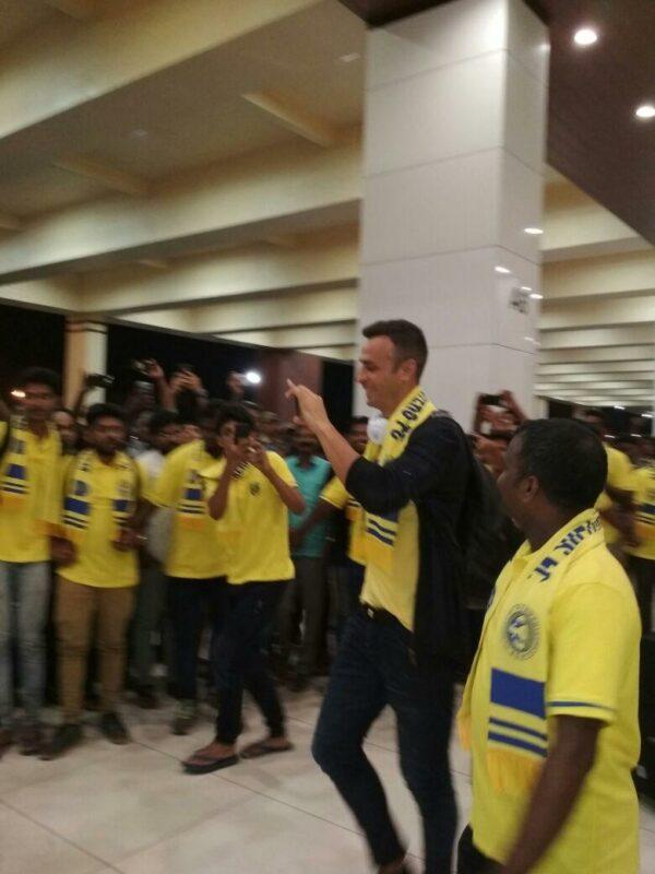 ? @kbfc_manjappada Welcoming our own Dimitar Berbatov with special Scarf and Yellow flowers at 3.00 AM@KeralaBlasters pic.twitter.com/ylelZBzFZI