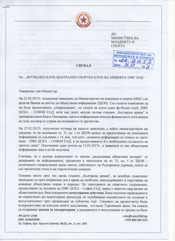 21.02.2017 г. – Подаване на заявление за за достъп до „споразумението“ между ММС и наемателите на стадион „Българска Армия“ и базата в Панчарево.