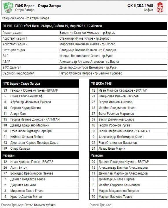 Берое посреща ЦСКА 1948 в мач от XXIV кръг на Първа лига. Двубоят започва в 12:30 ч., а в него старозагорци ще опитат да спрат черна серия срещу „армейците“. Заралии все още нямат победа над съперника. Те са играли 4 срещи за първенство и 1 за купата, а балансът в тях е 3 загуби и две равенства. Освен това, Петър Хубчев ще опита да върне заралии на победния път след трите поредни загуби от Локо Пд и Арда в елита и Славия за купата.