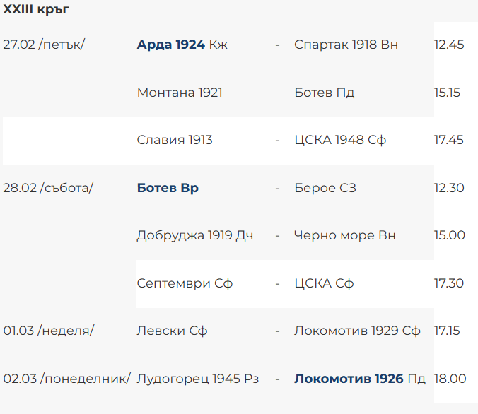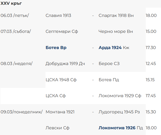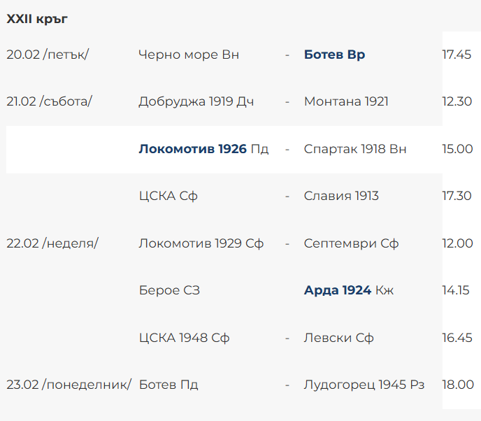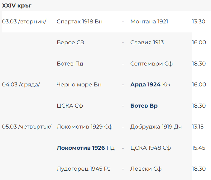 Спортно-техническата комисия към Българския футболен съюз обяви програмата за още 4 кръга от родния футболен елит.