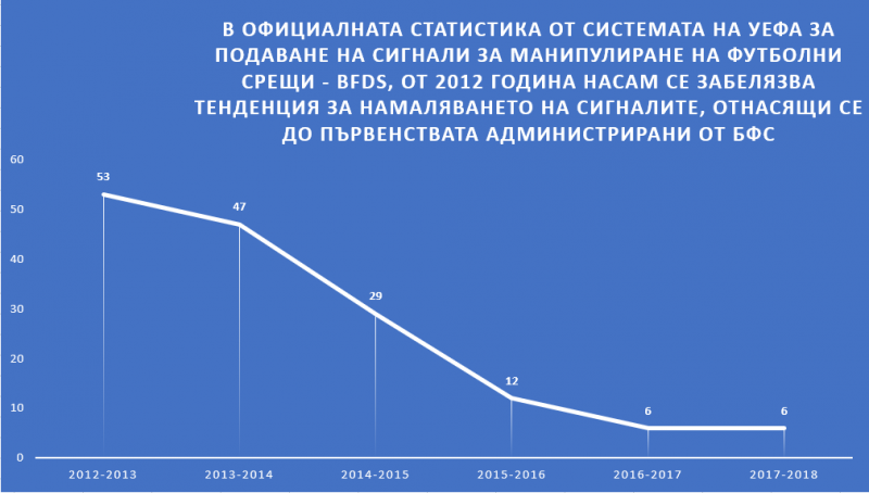 През сезон 2012/2013 г. тези сигнали са около 50, за миналия сезон 2017/2018 г. са 6, а през настоящата кампания са 3. Мониторингът върху всички срещи, провеждани в Европа, се осъществява от основния партньор на УЕФА и ФИФА Sportradar, с който БФС през миналата година сключи договор за превенция на отборите от Първа и Втора професионална лига и U19. С половината клубове от Първа и Втора професионална лига вече са проведени обучителни семинари, като кампанията ще продължи до края на тази година.