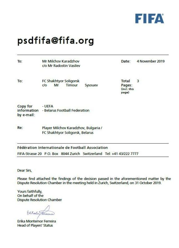 Но сега успя да ги осъди. Той бе представляван в делото от водещия ни адвокат в тази област Радослав Василев. Решението на ФИФА е от 31-ви октомври, а документа бе получен вчера. И решението е в полза на Иван Караджов.