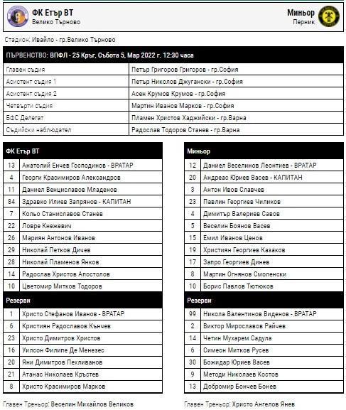 Етър победи категорично Миньор в дербито на XXV кръг на Втора лига. На стадион „Ивайло“ във Велико Търново „болярите“ се наложиха с 3:0. По този начин възпитаниците на Веселин Великов събраха актив от 51 точки и са на второ място във временното класиране. Селекцията на Христо Янев пък остава с 45 пункта на четвърта позиция.