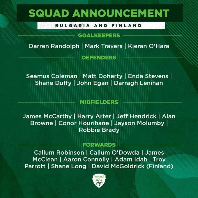 Защитници: Шеймъс Коулмън (Евертън, Англия), Мат Дохърти (Уулвърхемптън, Англия), Енда Стивънс и Джон Егън (Шефийлд Юнайтед, Англия), Шейн Дъфи (Брайтън, Англия), Дара Ленихън (Блекбърн, Англия)