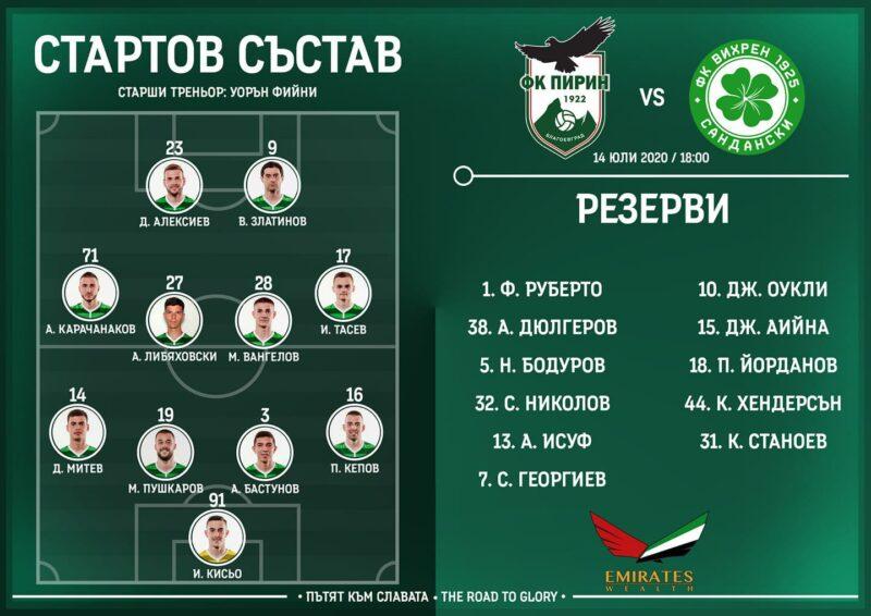 Големият фаворит във Втора лига Пирин Благоевград ще изиграе днес четвъртата си контрола от предсезонната подготовка. Орлетата излизат срещу Вихрен Сандански на стадиона в Разлог. Наставникът Уорън Фийни е пуснал в състава предимно юноши,като по всичко личи,че титулярите ще играят в четвъртък срещу ЦСКА 1948 в Благоевград.За Вихрен това е първата контрола от лятната подготовка.Орлетата отново ще играят с нетрадиционния виолетов екип.