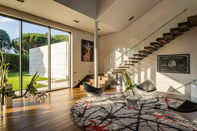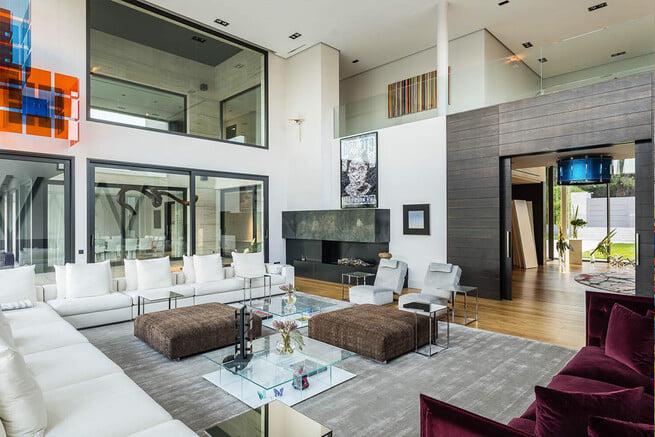 Къщата разполага с 9 спални, 9 бани, стая за масажи, фитнес зала, офис с изглед към градината и гараж за 10 автомобила.