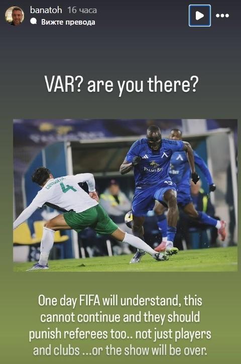 „ВАР, там ли си? Един ден ФИФА ще разбере, това не може да продължава и трябва да наказват и съдии също, не само играчи и клубове, или шоуто ще приключи“, написа Банато в Instagram.