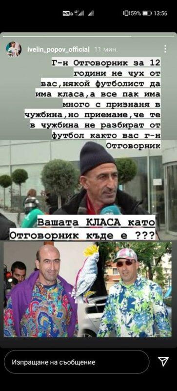 „Г-н Отговорник, за 12 години не чух от Вас някой футболист да има класа, а все пак има много с признания в чужбина, но приемаме, че те в чужбина не разбират от футбол както Вас, г-н Отговорник. Вашата класа като отговорник къде е?“, написа Попето в Инстаграм.