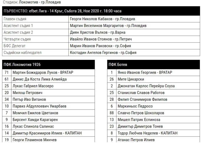 Локомотив Пд: 71. Мартин Луков, 61. Диниш Алмейда, 25. Лукас Масоеро, 20. Милош Петрович, 34. Петър Витанов, 10. Парвиз Умарбаев, 7. Момчил Цветанов, 9. Бирсент Карагерен, 16. Лукас Салинас, 14. Димитър Илиев, 19. Георги Минчев