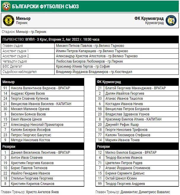 Миньор победи Крумовград в мач от III кръг на Втора лига. На Стадиона на мира в Перник домакините се наложиха с класическото 3:0. Това бе първо поражение в първенството за гостите, които досега имаха две победи от два мача. „Чуковете“ пък от своя страна се върнаха към успехите, след като в първия кръг разгромиха с 5:1 дубъла на Лудогорец, но във втория отстъпиха с 0:2 при визитата си на Добруджа.
