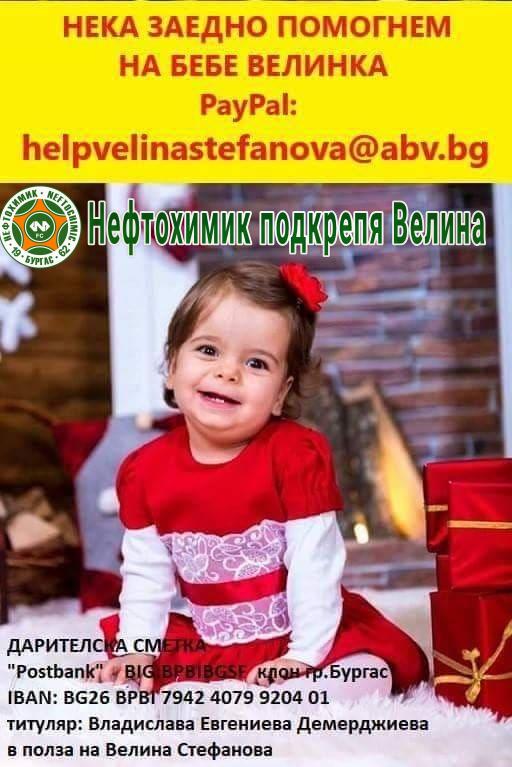 Нефтохимик ще вземе участие в коледния футболен турнир в подкрепа на малката Велина Стефанова. Детето е с диагноза вътрешна хидроцефалия. Малко след като и поставят шънт, за да овладеят заболяването, последвалите изследвания показват туморно образувание в мозъка. Семейството на Велина не разполага с нужните средства, за да продължи борбата с болестта, затова им е необходима помощ.
