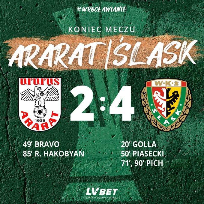 Полският Шльонск Вроцлав направи огромна крачка към класиране за третия квалификационен кръг на Лига на конференциите, след като спечели с 4:2 гостуването на Арарат Ереван.