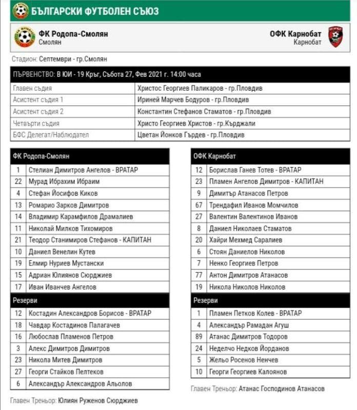 Първи резултата откриха гостите чрез Стаматов, който успя след изпълнение на фал от близо 30 метра да изпрати топката в долният ляв ъгъл на Стелиан Ангелов. Отговорът на отбора от Смолян обаче не закъсня. Само четири минути по-късно, капитанът на „зелено-белите“ успя перфектно да изпълни отсъден наказателен удар пред вратата на „Карнобат“. Изстреляната топка от Стефанов премина през стената на гостите и се заби в долният десен ъгъл на Борислав Тотев. В 37 – та минута Валентин Иванов спъна в наказателното поле на „Карнобат“ Даниел Кутев, заради което главният съдия в двубоя Христос Паликаров отсъди дузпа в полза на домакините. Наказателният удар бе изпълнен от Кутев, който не сбърка и направи резултата 2:1. Отново той успя да вкара гол в 46 – та минута след изпълнен корнер.