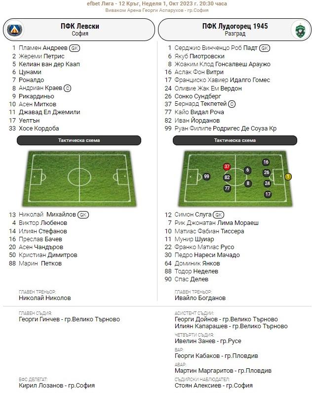 Български футболЛевскиЛудогорецПърва професионална лига СЪСТАВИ: Левски посреща Лудогорец от Желязко Велков - 01.10.2023 0 FacebookTwitterPinterestWhatsApp Снимка: levski.bg - - Левски приема Лудогорец в голямото дерби на XII кръг на efbet Лига. Двубоят на стадион „Георги Аспарухов“ започва в 20:30 ч. Ето и съставите на двата отбора: