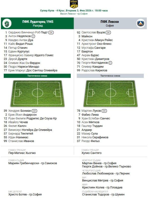 Български футболЛевскиЛудогорец СЪСТАВИ: Лудогорец – Левски! Око-Флекс е титуляр, Переа – резерва от Желязко Велков - 03.02.2026 0 FacebookTwitterPinterestWhatsApp Снимка: ludogorets.com - - Лудогорец и Левски излизат в мач за Суперкупата на България. Двубоят на Националния стадион „Васил Левски“ започва в 18:00 ч. Старши треньорите на „зелени“ и „сини“, Пер-Матиас Хьогмо и Хулио Веласкес, избраха титулярните си единайсеторки. СЪСТАВИ: