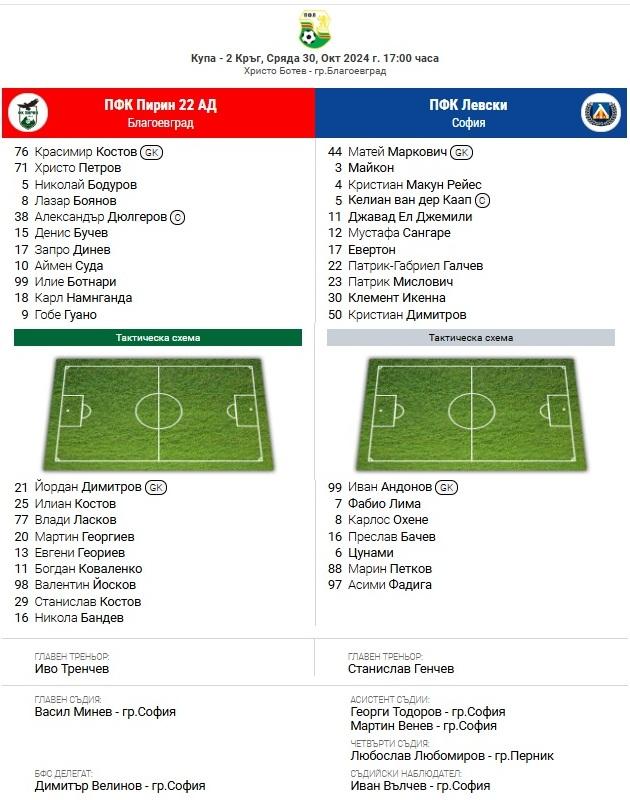 Български футболЛевскиПирин Бл СЪСТАВИ: Пирин (Бл) – Левски от Желязко Велков - 30.10.2024 0 FacebookTwitterPinterestWhatsApp Снимка: levski.bg - - Левски гостува на Пирин (Бл) в мач от 1/16-финалите за Купата на България. Двубоят започва в 17:00 ч. Ето и съставите на двата отбора:
