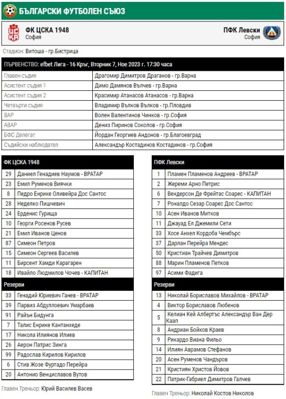 Български футболЛевскиПърва професионална лигаЦСКА 1948 СЪСТАВИ: ЦСКА 1948 – Левски! Ел Джемили отново е титуляр за „сините“, Краев – резерва от Желязко Велков - 07.11.2023 0 FacebookTwitterPinterestWhatsApp Снимка: levski.bg - - ЦСКА 1948 посреща Левски в мач от XVI кръг на efbet Лига. Двубоят на стадион „Витоша“ започва в 17:30 часа, а главен съдия е Драгомир Драганов. Ето и съставите на двата отбора:
