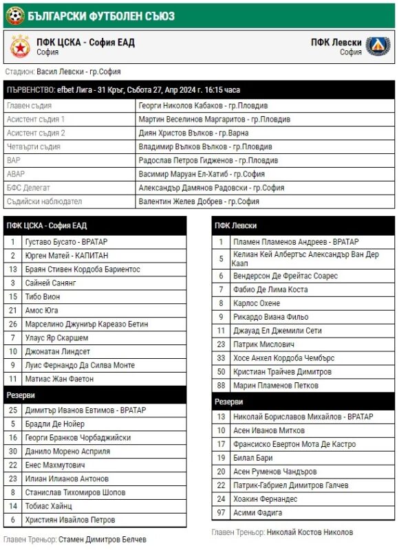 ЦСКА-София и Левски се изправят един срещу друг в първи мач от първата шестица на Първа лига. Дербито на стадион “Васил Левски” започва в 16:15 ч. и ще бъде ръководено от Георги Кабаков.
