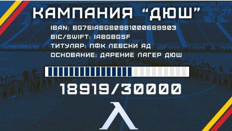 Феновете на Левски продължават с безпрецедентната си помощ към клуба. Те са вече изключително близо до постигането на поредната цел – осигуряване на лагер за талантите до 17 и до 19 години. „Сините“ привърженици направиха ново изумително постижение, като само за ден събраха над 3000 лева, с което общо стават 18919 лева. Така до заветната цел от 30000 лева остават малко над 11000 лева.