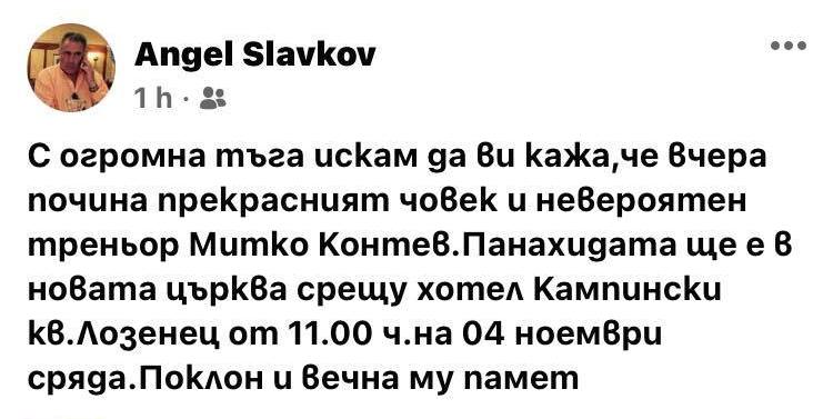 „С огромна тъга искам да ви кажа,че вчера почина прекрасният човек и невероятен треньор Димитър Контев.Панахидата ще е в новата църква срещу хотел Кампински кв.Лозенец от 11.00 ч.на 04 ноември сряда.Поклон и вечна му памет“, написа Славков във Фейсбук.
