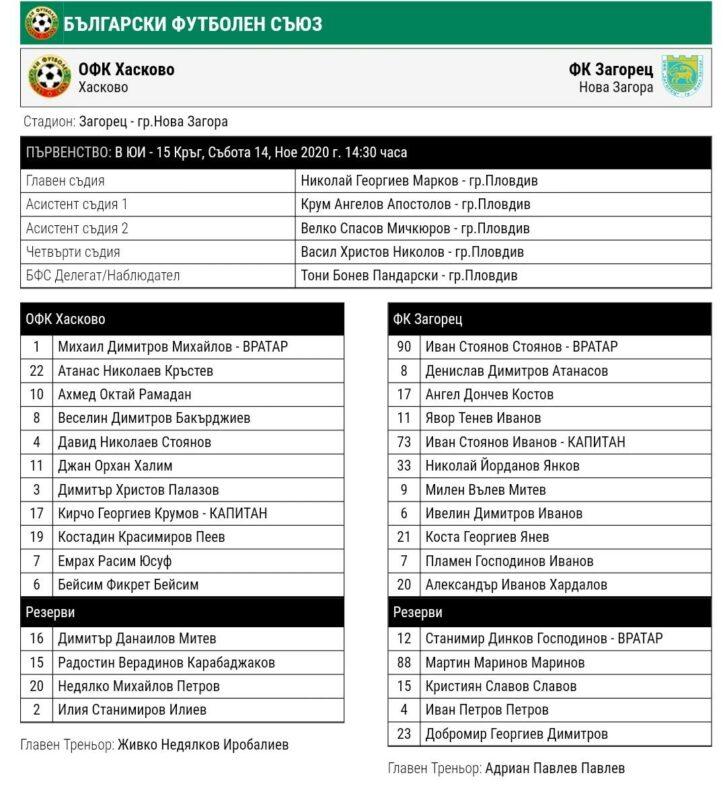 Футболистите на Загорец решиха мача още преди почивката с голове на Пламен Иванов 26-та, Денислав Атанасов 32-та и Коста Янев в 40-тата минута. Те остават и най-резултатния отбор в групата – вкарали са цели 47 гола. В класирането Загорец е на втора позиция с 35 точки, с 3 по-малко от лидера Черноморец Бургас. Но и с мач по-малко. За Хасково това бе втора поредна загуба,след като преди седмица падаха с 0:2 и при гостуването на Димитровград.